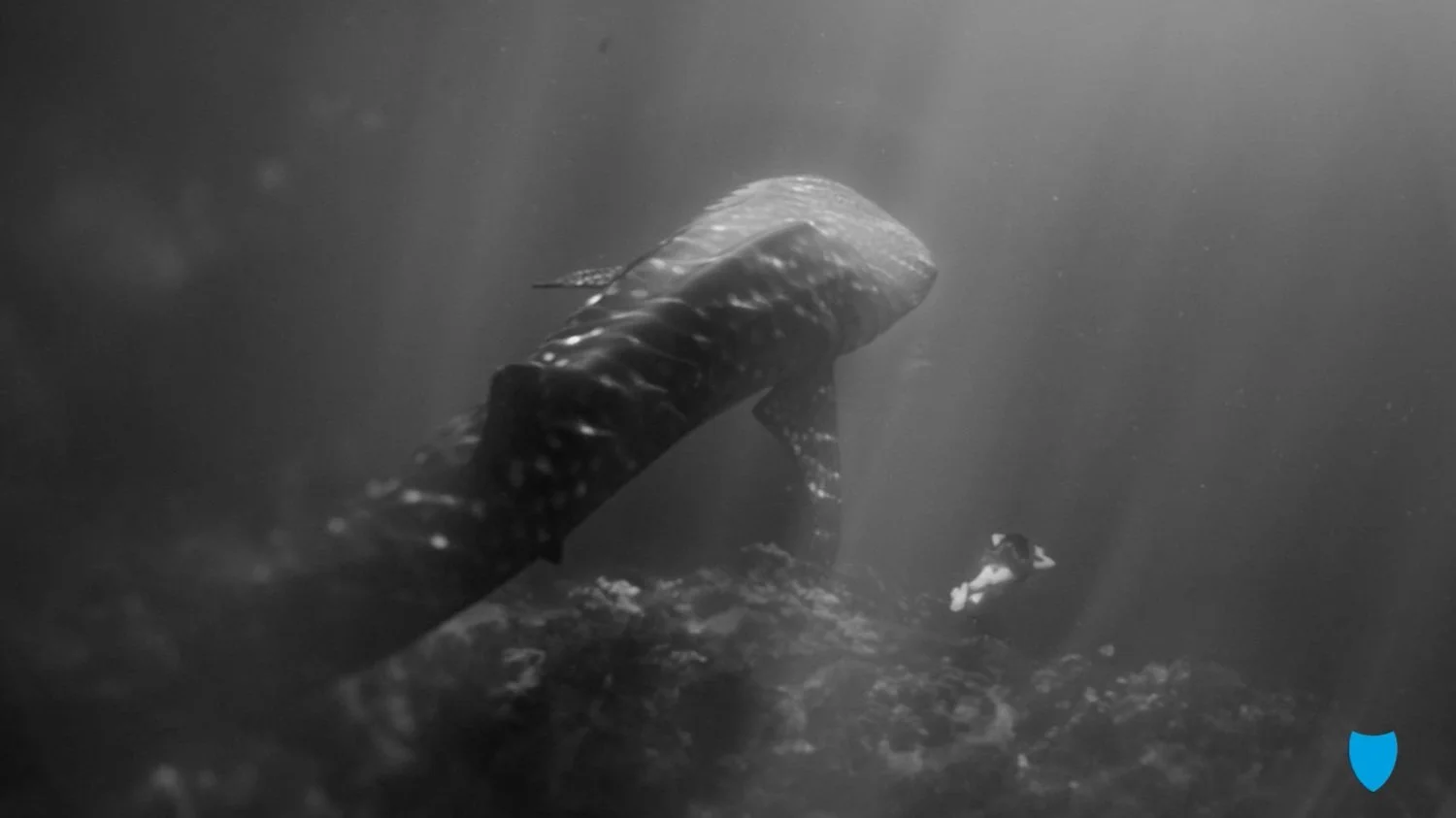 We open on a black & white underwater shot, rich with texture and depth. Dolphins swim by. Fish wander. Seaweed sways. There’s a different sense of time and space down here, as in a dream…